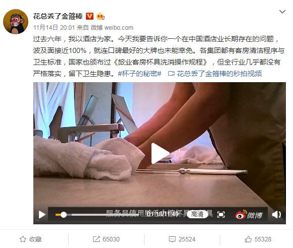 11月14日,微博大V“花總丟了金箍棒”(下文簡稱“花總”)發(fā)布的一段名為《杯子的秘密》的視頻,再度對國內(nèi)**酒店的衛(wèi)生問題提出了質(zhì)疑。